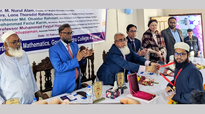 ফরিদপুরের সরকারী রাজেন্দ্র কলেজের গণিত বিভাগের ২জন কৃতি শিক্ষার্থীকে এ.এফ মুজিবুর রহমান ফাউন্ডেশনের পক্ষ থেকে এক ভরি ওজনের স্বর্ণপদক, নগদ অর্থ ও সনদপত্র প্রদান করা হয়েছে।