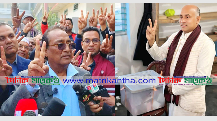 গতকাল ১২ই ফেব্রুয়ারি ত্রয়োদশ জাতীয় সংসদ নির্বাচন ও গণভোট-২০২৬ অনুষ্ঠিত হয়। নির্বাচনে রাজবাড়ী-১ আসনে বিএনপি মনোনীত প্রার্থী সাবেক সংসদ সদস্য আলী নেওয়াজ মাহমুদ খৈয়ম(ধানের শীষ) পুনরায় এবং রাজবাড়ী-২ আসনে বিএনপি মনোনীত প্রার্থী মোঃ হারুন-অর রশিদ(ধানের শীষ) প্রতীক বেসরকারিভাবে নির্বাচিত হয়েছেন। ছবিতে বামে গতকাল বৃহস্পতিবার সকালে ভোটাধিকার প্রয়োগের পর আলী নেওয়াজ মাহমুদ খৈয়ম এবং মোঃ হারুন-অর রশিদ বিজয় চিহ্ন প্রদর্শন করেন -মাতৃকণ্ঠ।